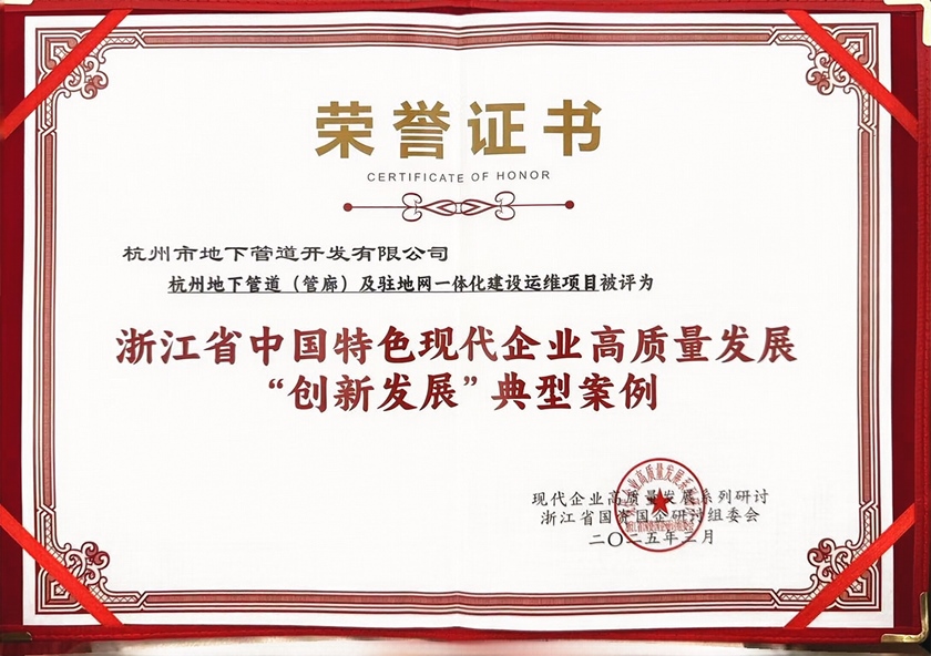 集團(tuán)所屬地下管道公司申報(bào)的杭州地下管道(管廊)及駐地網(wǎng)一體化建設(shè)運(yùn)維項(xiàng)目榮獲“浙江省中國特色現(xiàn)代企業(yè)高質(zhì)量發(fā)展‘創(chuàng)新發(fā)展’典型案例”。